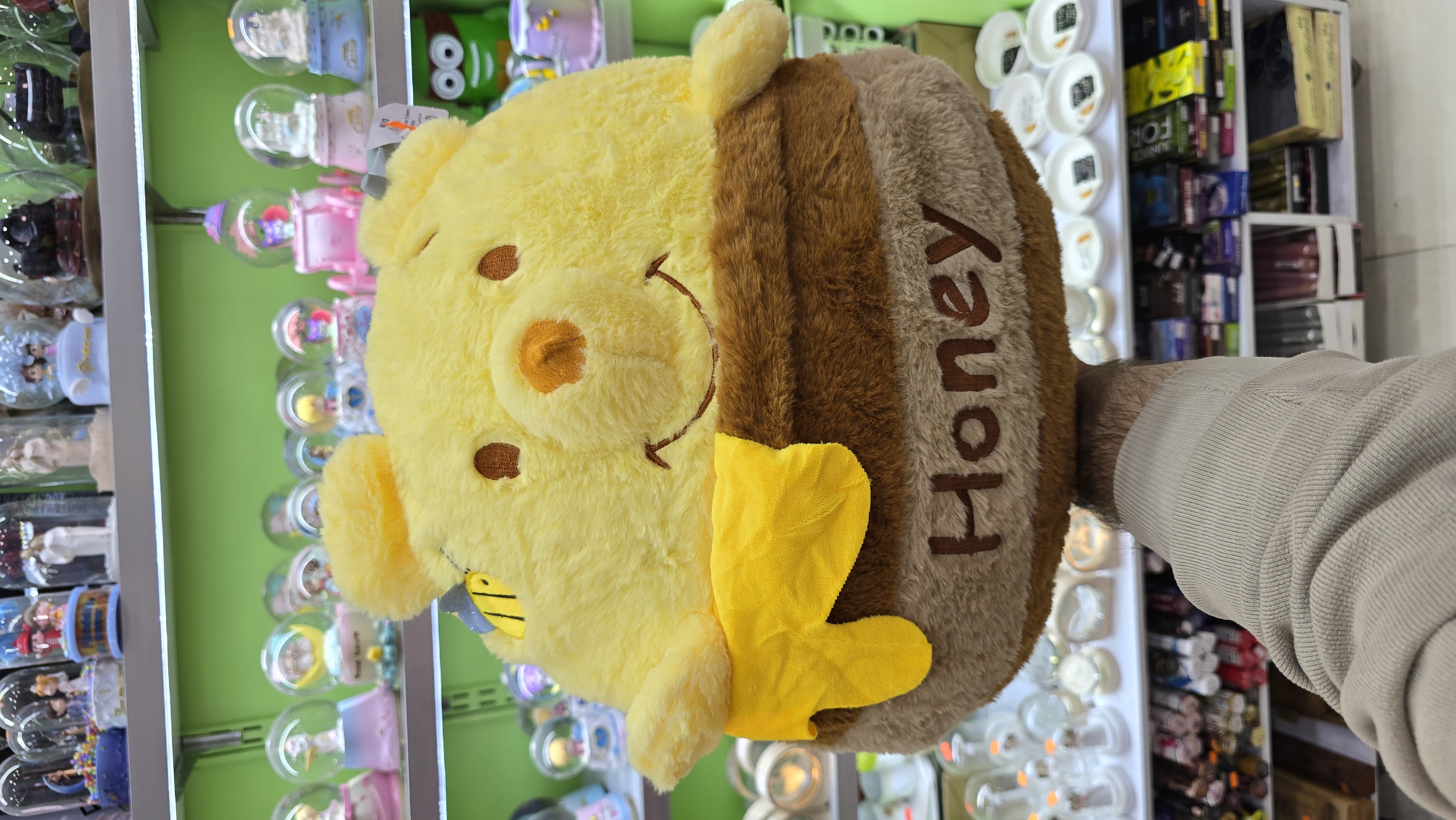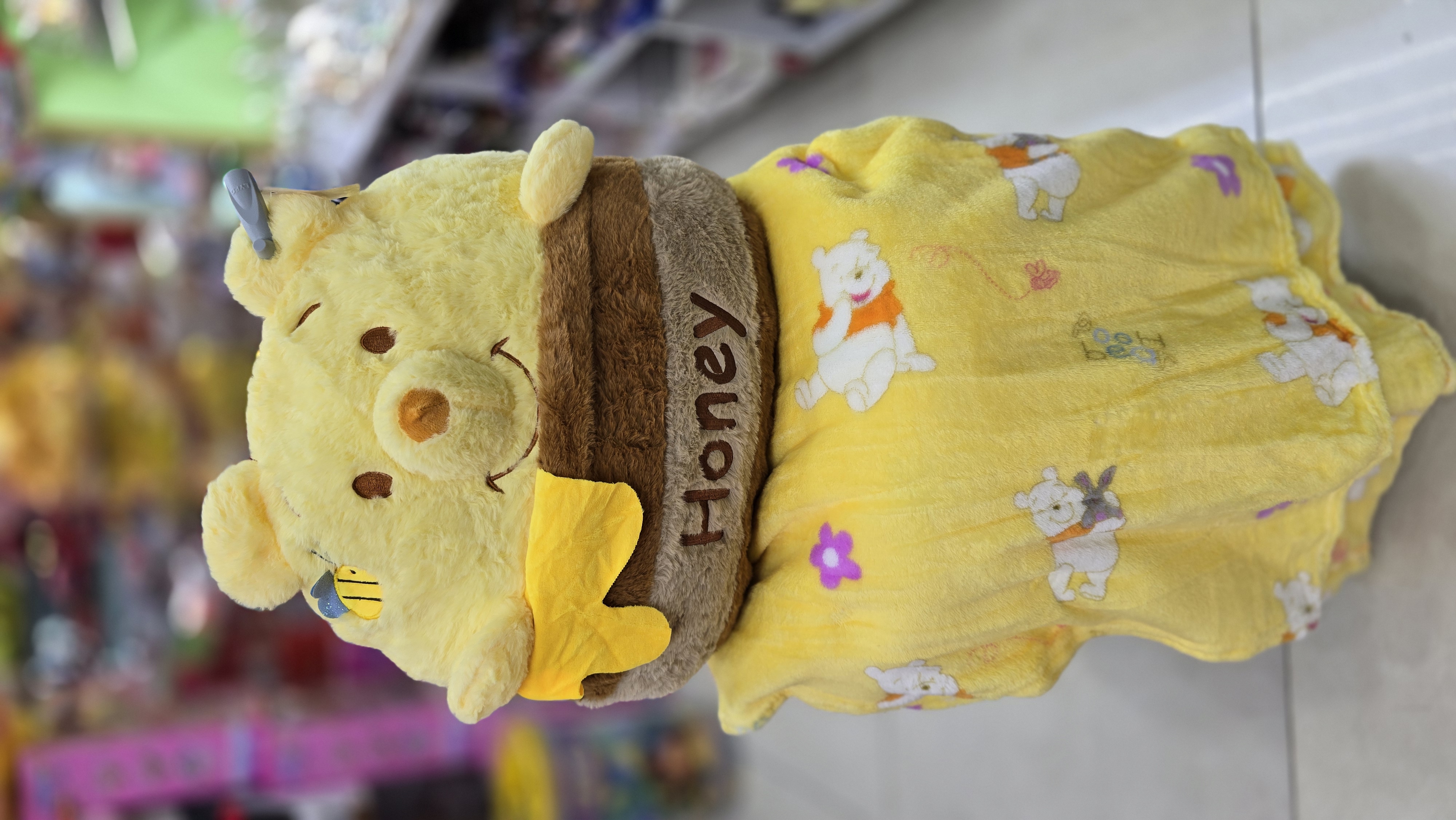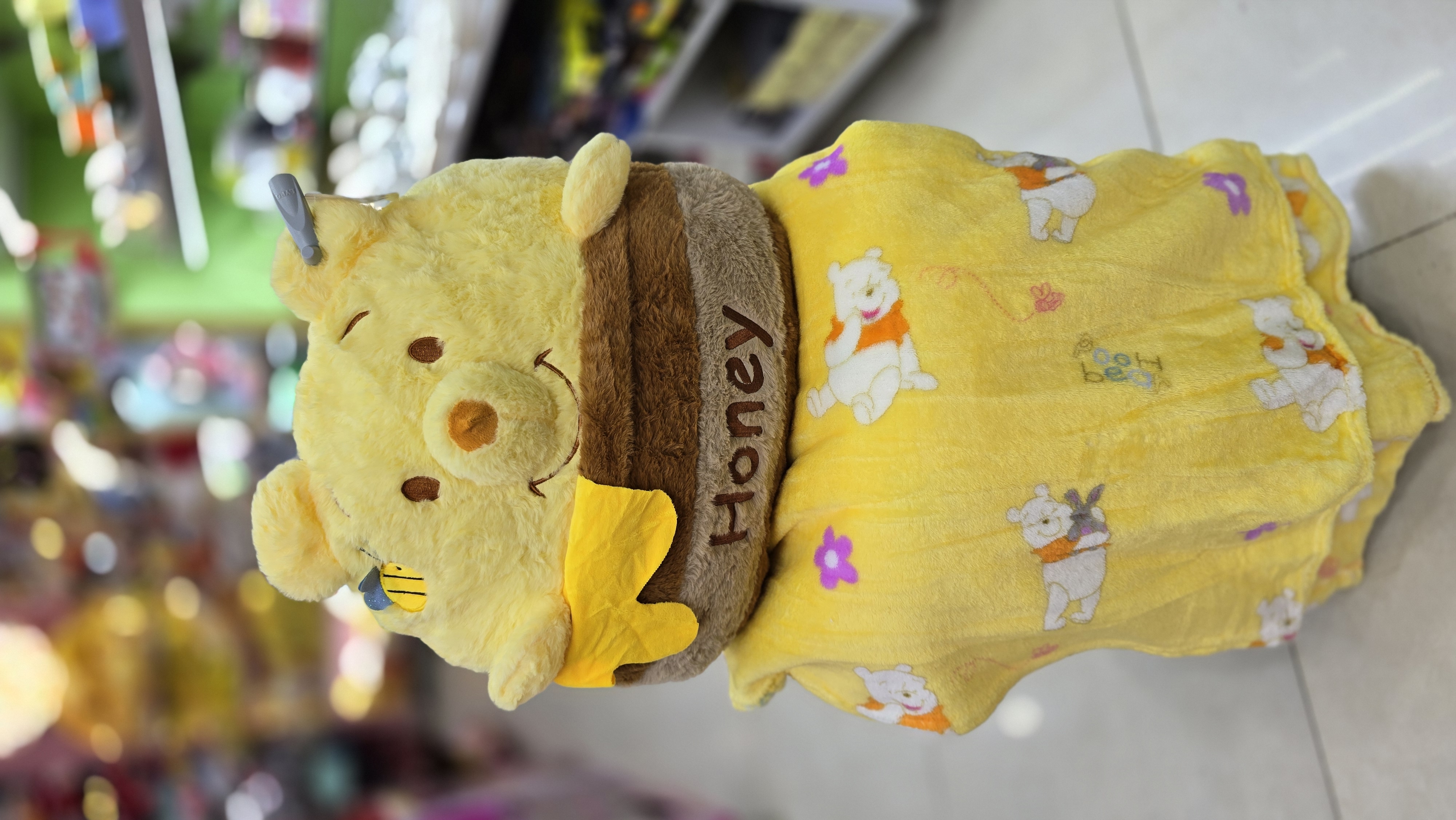 عروسک پتوبالشتی خرس پو ۴۰ سانتی با یه پتو ۱۱۰×۱۶۰ سانت وطرح دار وبسیار نرم ولطیف و مناسب برای بچه ها وسیسمونی نوزاد